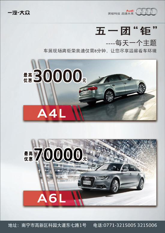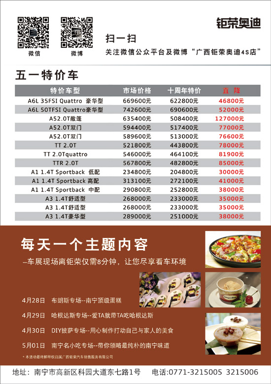 4月28日至5月1日,廣西鉅榮奧迪掀起A4L、A6L超值鉅惠狂潮,更有多款特價(jià)車型等待著您!同時(shí),在鉅榮奧迪展廳內(nèi)將開展系列主題活動,讓您避開擁擠人潮,盡享溫馨賞車、購車環(huán)境。