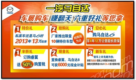 據(jù)了解,此次車展優(yōu)惠力度空前,馬自達6特惠價13萬,購馬6任意車型還可尊享4年或12萬公里的超長保修期。購Mazda6睿翼享受最高24個月的免息貸款!最后三天的瘋狂,趕緊出手吧!