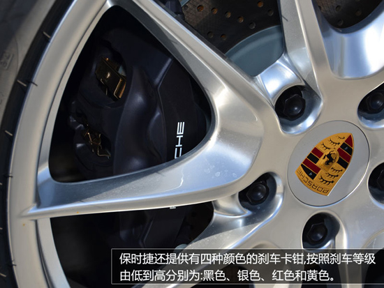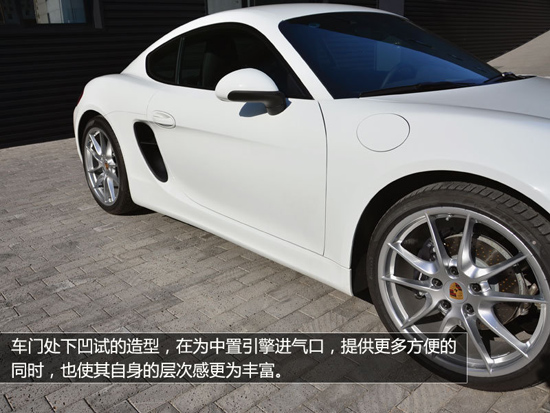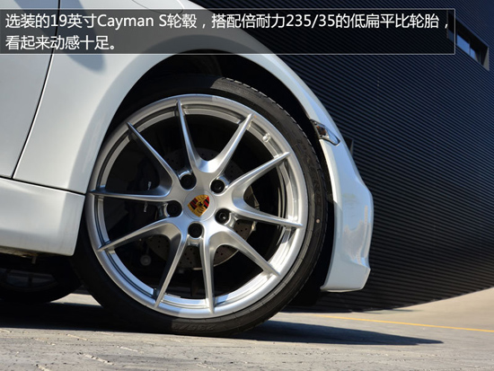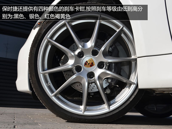 車門處下凹試的造型,在為中置引擎進氣口,提供更多方便的同時,也使其自身的層次感更為豐富,同時這款Cayman所使用的輪轂,是經(jīng)過選裝的19英寸Boxster S車輪,當(dāng)然如果你喜歡,保時捷還提供多種樣式可供選裝,比如18英寸Boxster車輪、20英寸Carrera S車輪、20英寸Carrera Classic雙色調(diào)組合車輪以及20英寸SportTechno車輪等多種組合。同時,保時捷還提供有四種顏色的剎車卡鉗,按照剎車等級由低到高分別為:黑色、銀色、紅色和黃色,本次實拍的這臺車安裝的就是標配的黑色卡鉗,給人的整體感覺還是比較霸氣的。