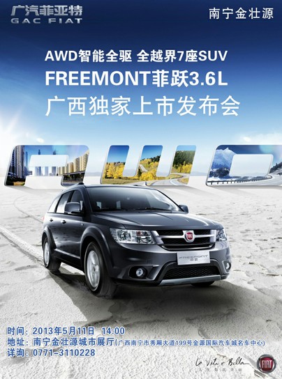 2013年5月11日,F(xiàn)reemont菲躍3.6L智能全驅(qū)版和2.4L豪華導(dǎo)航版將在廣汽菲亞特南寧金壯源店榮耀上市!繼續(xù)演繹全越界SUV掌控自由的馳騁之感!