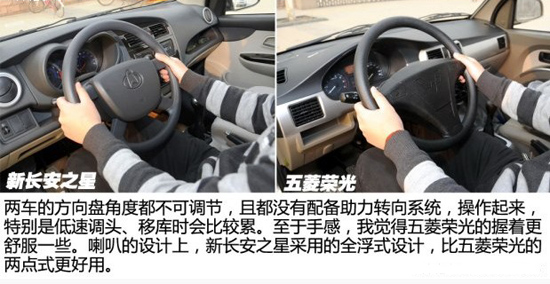 方向盤兩車都沒有采用皮革包裹、角度也不能調(diào)節(jié)。從造型來說,我個人比較偏愛新長安之星的四輻式設計,但實際握感倒是五菱榮光的更好,它的外圈比較粗壯而且手感還略帶軟性。至于喇叭按鍵,新長安之星采用的全浮式設計顯然比五菱榮光的兩點式更好用,這點毫無懸念。
