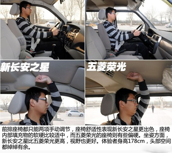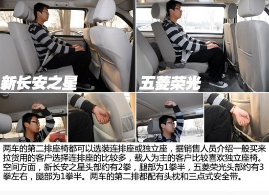 空間方面,無論是新長安之星還是五菱榮光頭部空間都非常充裕,身高178cm的體驗者坐入車內(nèi)不管在第一排、第二排還是第三排都毫無壓力。腿部空間方面,兩車的表現(xiàn)差異也不大,正常情況下第二排乘客腿部空間基本都在1.5拳左右,第三排腿部空間都在1拳上下。