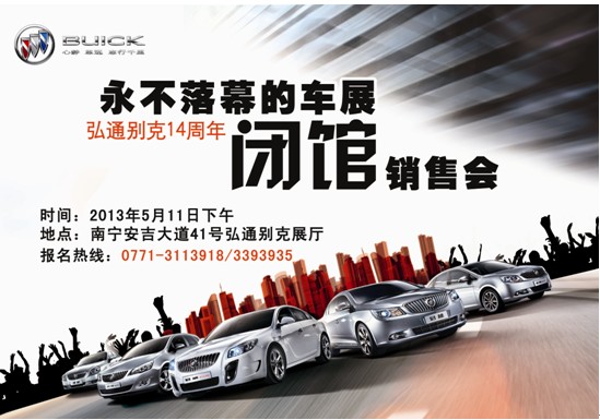 5月11日下午14:00弘通別克4S店特推出“永不落幕的車展—閉館銷售會(huì)”,將延續(xù)安吉車展優(yōu)惠政策,購車千元豪華大禮相送。2013全新別克君越3.0L旗艦版已到店,歡迎廣大車友預(yù)訂購車!弘通別克讓您即刻擁有心中座駕, 別人尚在夢(mèng)想,您已自如駕馭夢(mèng)想……
