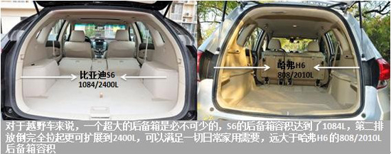 另外,比亞迪S6的內(nèi)部空間也設(shè)計得更加人性化,車門壁儲物槽、前排儲物格、杯架等諸多便利實用的儲物空間,為駕乘者創(chuàng)造了“隨手放”的可能。對于越野車來說,一個超大的后備箱是必不可少的,S6的后備箱容積達(dá)到了1084L,第二排放倒完全拉起更可擴(kuò)展到2400L,可以滿足一切日常家用需要,遠(yuǎn)大于哈弗H6 的808/2010L后備箱容積。