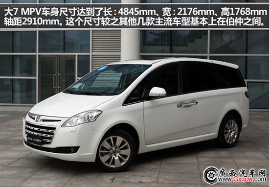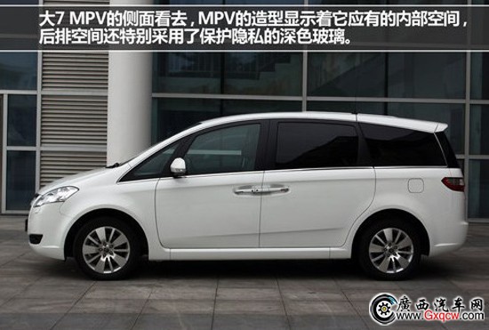 大7 MPV的側面看去,MPV的造型顯示著它應有的內部空間,后排空間還特別采用了保護隱私的深色玻璃。大7 MPV車身尺寸達到了長:4845mm、寬:2176mm、高1768mm,軸距2910mm。這個尺寸較之其他幾款主流車型基本上在伯仲之間。