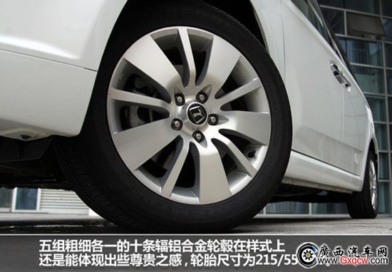 五組粗細各一的十條輻鋁合金輪轂在樣式上還是能體現出這款車的尊貴之感,輪胎尺寸為215/55 R17。