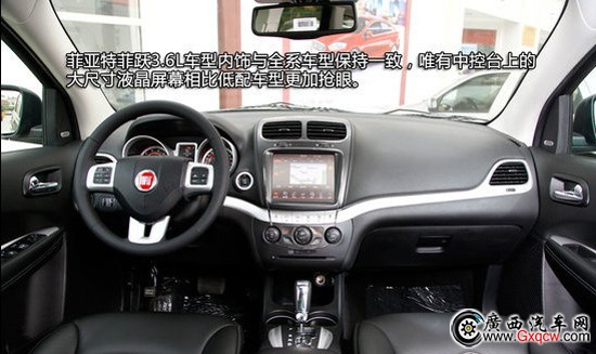 菲亞特菲躍3.6L車型內(nèi)飾與全系車型保持一致,唯有中控臺上的大尺寸液晶屏幕相比低配車型更加搶眼。帶有液晶顯示屏的儀表盤以及多功能方向盤都是全系標(biāo)配的。而自動大燈只有2.4L豪華導(dǎo)航版以及3.6L智能全驅(qū)版才有。