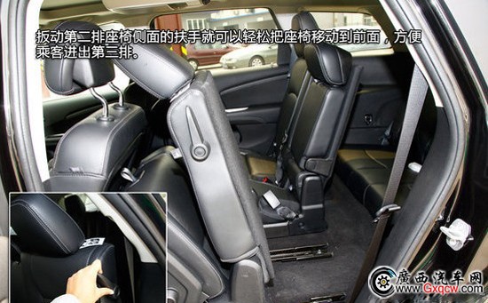 扳動第二排座椅側(cè)面的扶手就可以輕松的把座椅移動到前面,方便乘客進(jìn)出第三排。在7座的情況下,尾箱內(nèi)可以滿足一般的使用需求,蓋板的設(shè)計(jì)比較人性化,內(nèi)部可以放置一些比較隱私的物品,而在第二、三排座椅全部放倒之后的情況下,車內(nèi)的儲物空間非?捎^,并且地板非常平整。