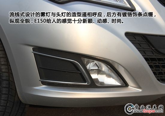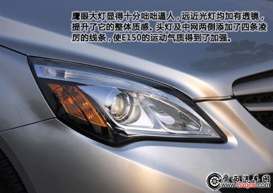 鷹眼大燈顯得十分咄咄逼人,遠(yuǎn)近光燈均加有透鏡,提升了它的整體質(zhì)感。頭燈及中網(wǎng)兩側(cè)添加了四條凌厲的線條,使E150的運(yùn)動(dòng)氣質(zhì)得到了加強(qiáng)。流線式設(shè)計(jì)的霧燈與頭燈的造型遙相呼應(yīng),后方有鍍鉻飾條點(diǎn)綴,縱觀全貌,E150給人的感覺十分新穎、動(dòng)感、時(shí)尚。