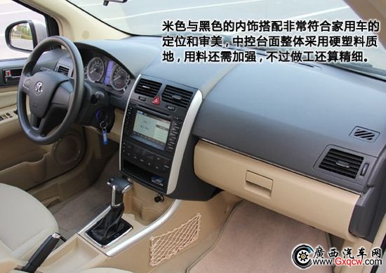 米色與黑色的內(nèi)飾搭配非常符合家用車(chē)的定位和審美,中控臺(tái)面整體采用硬塑料質(zhì)地,用料方面還需加強(qiáng),不過(guò)做工還算精細(xì)。