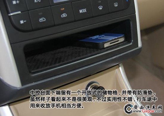 中控臺(tái)面下端留有一個(gè)開(kāi)放式的儲(chǔ)物格,并帶有防滑墊,雖然樣子看起來(lái)不是很美觀,不過(guò)實(shí)用性不錯(cuò),行車(chē)途中用來(lái)收放手機(jī)相當(dāng)方便。