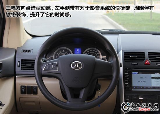 三幅方向盤(pán)造型動(dòng)感,左手側(cè)帶有對(duì)于影音系統(tǒng)的快捷鍵,周?chē)橛绣冦t裝飾,提升了它的時(shí)尚感。
