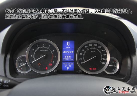 儀表盤(pán)的布局雖然不算很時(shí)髦,不過(guò)外圈的鍍鉻,以及幽蘭色的背光燈,還是為它增色不少,至少是看起來(lái)富有生機(jī)。行車(chē)電腦顯示屏面積較大,其中包括了多種信息,確保駕駛者安全、正確地駕駛車(chē)輛。
