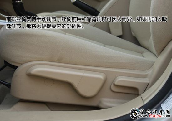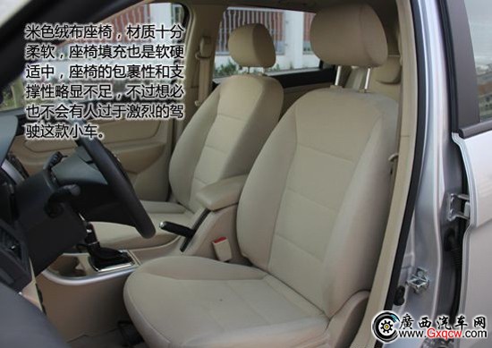 E150采用米色絨布座椅,材質(zhì)十分柔軟,座椅填充也是軟硬適中,座椅的包裹性和支撐性略顯不足,不過想必也不會(huì)有人過于激烈的駕駛這款小車。前排座椅支持手動(dòng)調(diào)節(jié),座椅前后和靠背角度可因人而異,如果再加入腰部調(diào)節(jié),那將大幅提高它的舒適性。