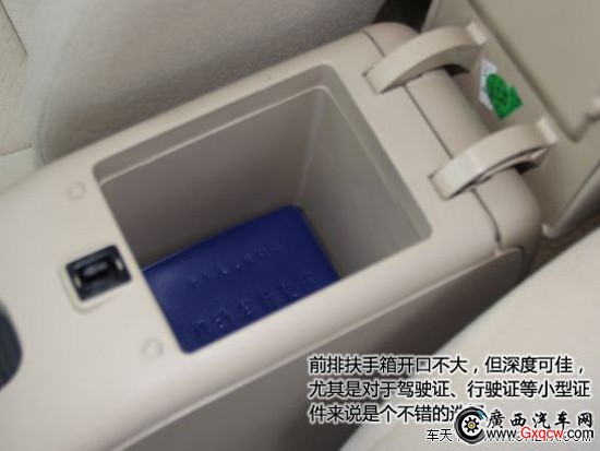 前排扶手箱開口不大,但深度可佳,尤其是對(duì)于駕駛證、行駛證等小型證件來說是個(gè)不錯(cuò)的選擇。