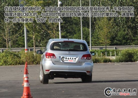 通過(guò)繞樁測(cè)試,我們可以了解到E150在操控性方面的特點(diǎn)。在連續(xù)快速的繞樁時(shí),它的底盤對(duì)側(cè)傾的抑制不是特別優(yōu)秀,車身側(cè)傾的幅度還是比較大的,與此同時(shí)駕駛員對(duì)車輛失去了部分的掌控力,速度稍快一點(diǎn)車身就有“脫軌”的趨勢(shì)。E150的方向盤采用機(jī)械液壓助力,在低速行駛的時(shí)候會(huì)比較沉重,轉(zhuǎn)向精準(zhǔn)度一般,屬于家用轎車風(fēng)格,一切以實(shí)用為主。