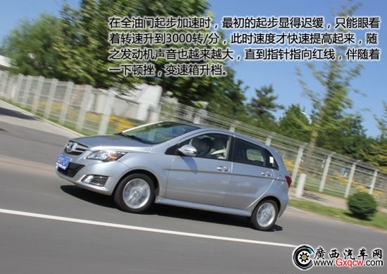 在全油門起步加速時(shí),最初的起步顯得遲緩,只能眼看著轉(zhuǎn)速升到3000轉(zhuǎn)/分,此時(shí)速度才快速提高起來(lái),隨之發(fā)動(dòng)機(jī)聲音也越來(lái)越大,直到指針指向紅線,伴隨著一下頓挫,變速箱升檔。在起步瞬間,E150的車身的后仰現(xiàn)象不是很明顯,這點(diǎn)做得不錯(cuò),保證了急加速時(shí)車內(nèi)人員的舒適性。