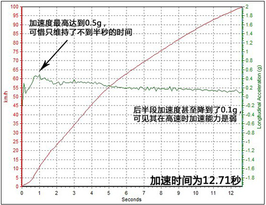 在實(shí)際行駛的道路上對(duì)北汽E系列1.5L車型的加速性能進(jìn)行了測(cè)試,它從0到100km/h的加速時(shí)間為12.71秒,這個(gè)成績(jī)屬正常范圍。從圖中曲線可以了解到,它的加速度最高達(dá)到0.5g,本是不錯(cuò)的表現(xiàn),可惜只維持了不到半秒的時(shí)間,反而后半段加速度甚至降到了0.1g,可見其在高速時(shí)加速能力是很弱的。圖中顯示速度曲線平穩(wěn),換擋沖擊表現(xiàn)并不明顯,而實(shí)際中駕駛者則可以明顯感覺到轉(zhuǎn)速?gòu)母咄蝗蛔兊蜁r(shí)車身的震動(dòng),可以說(shuō)變速箱在轉(zhuǎn)速銜接和速度的控制方面做得比較出色。