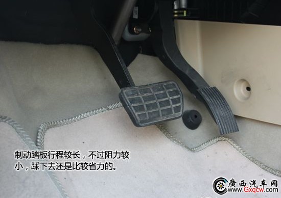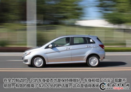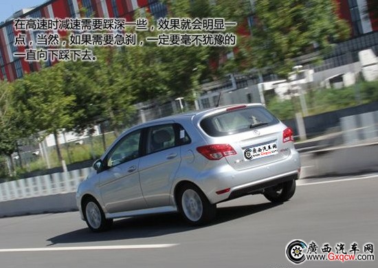 E150的制動(dòng)踏板行程較長(zhǎng),不過(guò)阻力較小,踩下去還是比較省力的。在高速時(shí)減速需要踩深一些,效果就會(huì)明顯一點(diǎn),當(dāng)然,如果需要急剎,一定要毫不猶豫的一直向下踩下去。在全力制動(dòng)時(shí),它的車身姿態(tài)也是保持得很好,車身前傾“點(diǎn)頭”現(xiàn)象不明顯,有效的提高了車內(nèi)人員的舒適度,這點(diǎn)是值得表?yè)P(yáng)的。