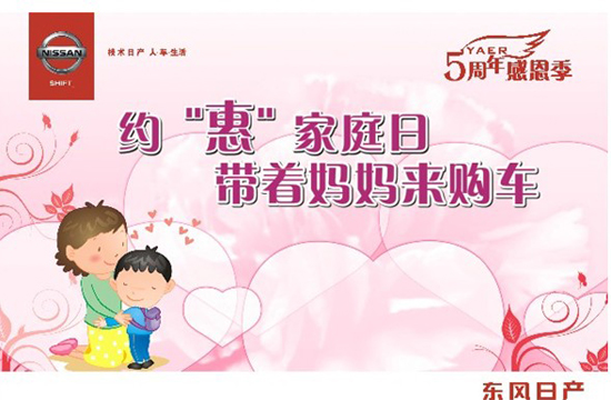 東風日產(chǎn)廣緣科園店5歲啦!5月,5周年盛典感恩季溫情開啟。敬請期待!5月11日,約“惠”家庭日,在母親節(jié)到來之際,帶著媽媽一起到東風日產(chǎn)廣緣科園店感受購車的樂趣與專業(yè)的服務。活動當天到店購車即可參與抽獎,車載冰箱、精美陶瓷、真皮錢包、代金券、體驗券!百分百中獎!帶著媽媽一起到廣緣科園店,讓媽媽享受舒適按摩旅程!凡蒞臨東風日產(chǎn)廣緣科園店的母親,均可獲精致美容面膜一盒,一起感恩母親的偉大,在節(jié)日里為您的母親親手敷上一片貼心的面膜,讓她青春永駐。到東風日產(chǎn)廣緣科園店為媽媽過個特別的母親節(jié)吧!
