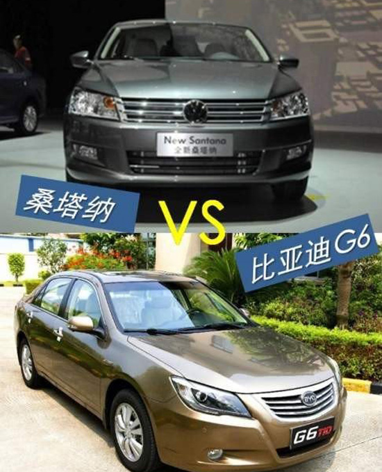 10萬元一直是很多消費者購車的預(yù)算節(jié)點。在這個區(qū)間,消費者可選擇合資品牌緊湊車或自主品牌中級車,車型很多,也因此很多人左挑右選,卻沒能買到中意的車型。進入中國市場20年之久的老牌明星車桑塔納,不僅贏得了銷量,更獲得了不錯的市場口碑,一度成為一個時代的代名詞。2011年9月上市的比亞迪G6也以其獨有的動力配置和超高的性價比,俘獲了不少國人的心,成了當仁不讓的自主中級車銷量王。今天,就讓我們來對比一下這兩款不同出生的車型,看看他們各自的優(yōu)勢分別在哪里。