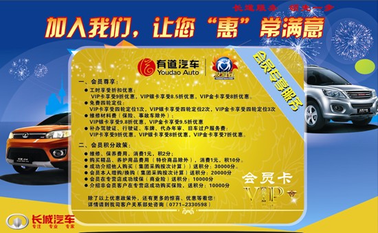 長城汽車聚焦廣西,廣西長道白沙旗艦店繼北部灣車展銷量突破歷史,現(xiàn)在旗艦店會員招募行動火爆啟動!加入廣西長道車友會員大家族,您即可享受到VIP至尊服務(wù)和一系列優(yōu)惠內(nèi)容!最高VIP金卡更可享受8折優(yōu)惠內(nèi)容!會員熱線:【廣西長道:(白沙4S店)0771-5780390;(安吉4S店)0771-2330301;(安吉直營店)0771-3922501 】