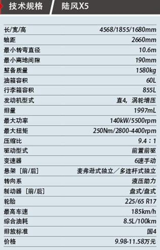 陸風(fēng)將為這臺(tái)發(fā)動(dòng)機(jī)配備8速自動(dòng)變速器,這也是X5的另一項(xiàng)賣(mài)點(diǎn),只不過(guò)先期上市的車(chē)型只是配備了6速手動(dòng)變速器,與目前長(zhǎng)城H6以及比亞迪S6在售的手動(dòng)款會(huì)產(chǎn)生直接競(jìng)爭(zhēng)。首批給媒體試駕的兩驅(qū)手動(dòng)擋X5均匹配由江西格特拉克生產(chǎn)的6擋手動(dòng)變速器,它的特點(diǎn)是1擋齒比較大,從2擋至6擋齒比細(xì)密,擋位很清晰,入擋的吸入感很強(qiáng)。從起步到加速,這套動(dòng)力系統(tǒng)的表現(xiàn)可以用“從容”來(lái)形容,渦輪的介入并不像德系增壓發(fā)動(dòng)機(jī)那么直接,中段加速時(shí)甚至感覺(jué)有點(diǎn)溫和。6擋變速器最大的優(yōu)勢(shì)也在于它的節(jié)油表現(xiàn),120km/h高速巡航,轉(zhuǎn)速也就控制在2500rpm以?xún)?nèi),表上顯示的平均油耗只有7.5L/100km。此時(shí)只要輕點(diǎn)油門(mén),動(dòng)力仍源源不斷傳至四個(gè)車(chē)輪,2.0T發(fā)動(dòng)機(jī)該有的水準(zhǔn)盡顯無(wú)遺。
