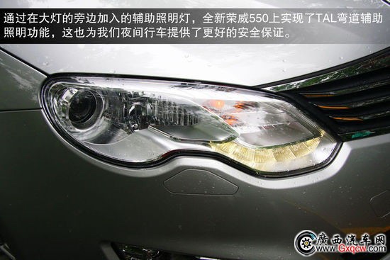 通過(guò)在大燈的旁邊加入的輔助照明燈,全新榮威550上實(shí)現(xiàn)了TAL彎道輔助照明功能,相比AFS動(dòng)態(tài)輔助照明,TAL彎道輔助照明響應(yīng)更快,這也為我們夜間行車(chē)提供了更好的保證。