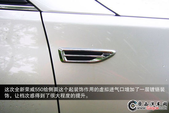 側(cè)面的變化主要集中在了輪轂和前翼子板上的起裝飾作用的進(jìn)氣口,這次全新榮威550給進(jìn)氣口增加了一層鍍鉻裝飾,讓檔次感得到了很大程度的提升。輪轂采用了7幅的17寸鋁合金輪轂,在整體的樣式上比老款車(chē)型力量感更強(qiáng)。