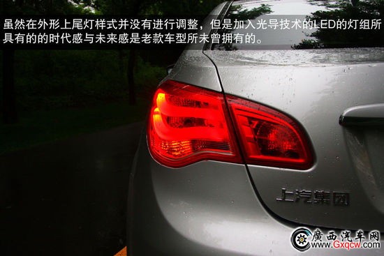 尾部最大的變化自然是尾燈的變化,雖然在外形上尾燈樣式并沒(méi)有進(jìn)行調(diào)整,但是重新設(shè)計(jì)加入光導(dǎo)技術(shù)的LED的燈組所具有的的時(shí)代感與未來(lái)感是老款車(chē)型所未曾擁有的。后風(fēng)擋上的鯊魚(yú)鰭天線的出現(xiàn)也為全新榮威550的尾部增色不少。