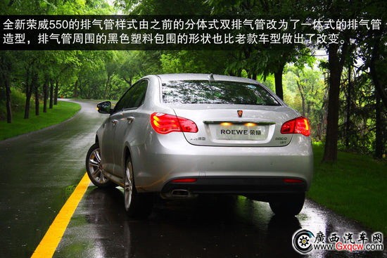 全新榮威550的排氣管樣式也比老款車(chē)型做出了一定的調(diào)整,由之前的分體式雙排氣管改為了一體式的排氣管造型,排氣管周?chē)暮谏芰习鼑男螤钜脖壤峡钴?chē)型做出了改變,讓整個(gè)尾部看起來(lái)更加動(dòng)感大氣。