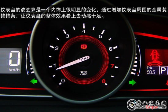 儀表盤的改變算是一個內(nèi)飾上很明顯的變化,通過增加儀表盤周圍的金屬裝飾飾條,讓儀表盤的整體效果看上去動感十足,加上可選背景色的儀表盤氛圍燈,可以讓每一個看到全新榮威550儀表盤的人都可能愛上它。