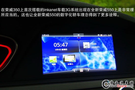 在榮威350上首次搭載的inkanet車載3G系統(tǒng)出現(xiàn)在全新榮威550上是非常理所應當?shù),這也讓全新榮威550的數(shù)字化轎車理念得到了更多解釋,這套系統(tǒng)將音樂、新聞、咨詢多媒體、第三方應用軟件擴展、整車系統(tǒng)查看、整車安防和救援融為了一體,通過搭配一塊800X480像素分辨率的觸摸液晶屏,讓操作這套系統(tǒng)成為了一件方便而快樂的事情。