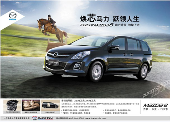 心懷進(jìn)取之力,人生方能前行不輟。2013款時(shí)尚全能MPV Mazda8煥芯登場(chǎng)!全新2.5L發(fā)動(dòng)機(jī),搭配5速手自一體變速箱,讓您從容尊享“宜商宜家”的愜意生活。
