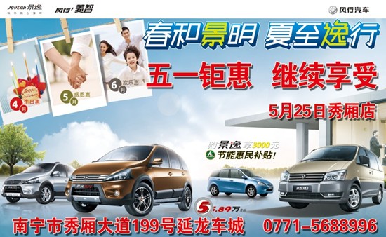 五月,5.1勞動節(jié)后,溫馨的母親節(jié),“感恩”成為5月最大的社會主旋律。為感謝廣大消費者的關(guān)注和支持,南寧坤馳風(fēng)行秀廂4S店將5月的活動主題定為“景致春滿園 感恩答謝惠”,同時在5月25日當(dāng)天舉行專場購車活動,近期想買車的朋友們可千萬別錯過了。