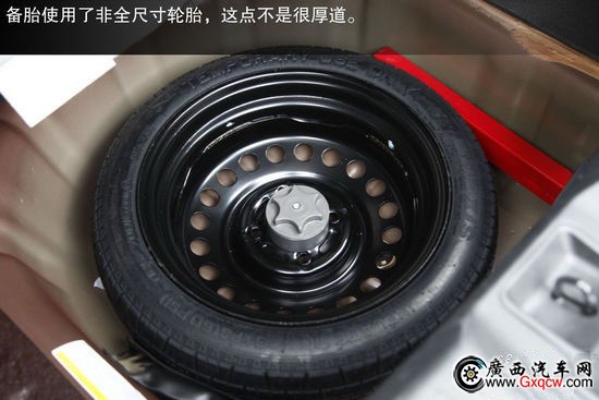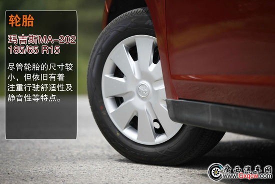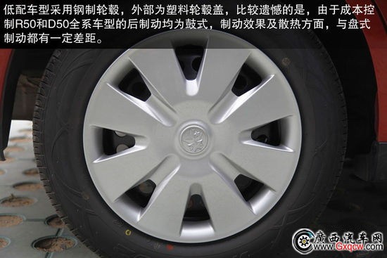 采用了瑪吉斯輪胎,規(guī)格為185/65 R15。輪胎特點(diǎn)為注重行駛舒適性及靜音性,備胎使用了非全尺寸輪胎。并且比較遺憾的是,由于成本控制R50和D50全系車型的后制動均為鼓式,制動效果及散熱方面,與盤式制動都有一定差距。