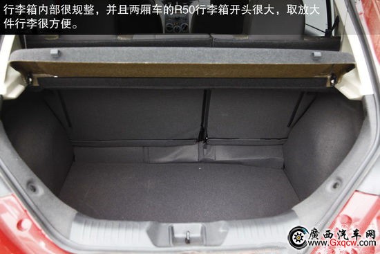行李箱內(nèi)部很規(guī)整,并且兩廂車的R50行李箱開頭很大,取放大件行李很方便。尾門開啟的高度適中,正常身高的女性朋友絲毫不用擔(dān)心。后排座椅靠背可分比例放倒,只是放倒后底板平整度不是很好。