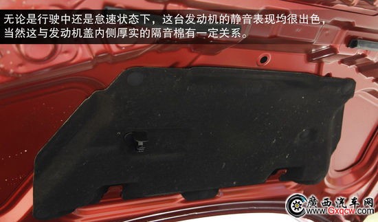 無論是行駛中還是怠速狀態(tài)下,這臺發(fā)動機(jī)的靜音表現(xiàn)均很出色,當(dāng)然這與發(fā)動機(jī)蓋內(nèi)側(cè)厚實(shí)的隔音棉有一定關(guān)系。
