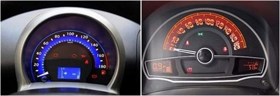 F0的儀表盤采用了藍色的背光,顯得科技感十足,顯示屏能提供油耗、里程數(shù)信息,很便于讀取。新QQ儀表盤使用了橙色的背光,圓潤卡通的時速表數(shù)字讀取不太方便,儀表盤下部的里程信息和油耗顯示左右分離。