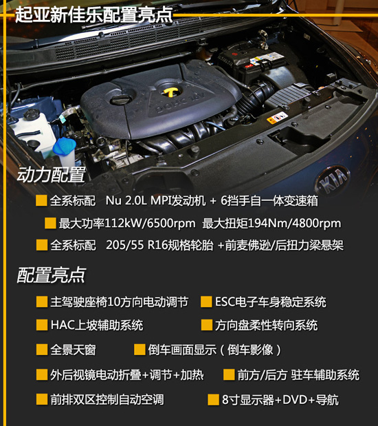 配置方面,第三代佳樂采用了Nu 2.0L MPI自然進(jìn)氣發(fā)動(dòng)機(jī),并搭配6擋手自一體變速箱。并且標(biāo)配全景天窗、一鍵啟動(dòng)、方向盤加熱、雙區(qū)自動(dòng)空調(diào)、電動(dòng)調(diào)節(jié)座椅及座椅加熱等。安全性方面則配備了車身穩(wěn)定控制、電動(dòng)助力轉(zhuǎn)向、6安全氣囊、HAC上坡輔助、前后方駐車輔助、ECM防炫目內(nèi)后視鏡、Active ECO系統(tǒng)等。