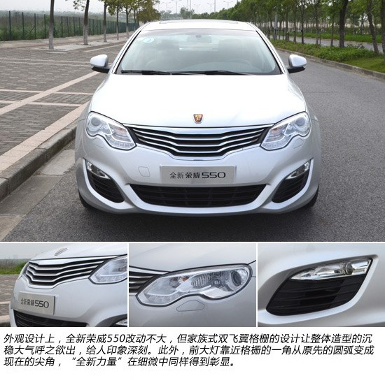 外觀設(shè)計(jì)上,全新榮威550改動(dòng)不大,但家族式雙飛翼格柵的設(shè)計(jì)讓整體造型的沉穩(wěn)大氣呼之欲出,給人印象深刻。此外,前大燈靠近格柵的一角從原先的圓弧變成現(xiàn)在的尖角,“全新力量”在細(xì)微中同樣得到彰顯。