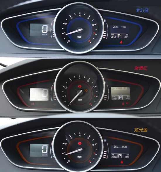 之前的各種宣傳,讓我毫無(wú)疑問(wèn)地將焦點(diǎn)首先落在了儀表盤(pán)的色彩調(diào)節(jié)上,通過(guò)中控屏幕上的操作提示,儀表盤(pán)的背景光可變換三種顏色:夢(mèng)幻藍(lán)、激情紅、炫光金,個(gè)性化地配合駕駛狀態(tài)和駕駛環(huán)境。不過(guò)在白天,激情紅和炫光金區(qū)分不是很明顯,夜幕降臨后應(yīng)該會(huì)更酷!