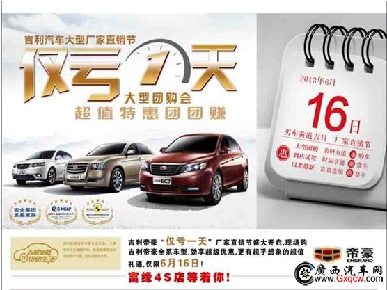 (廣西汽車網(wǎng) 訊)南寧帝豪富緣4S店6月16日,即將推出“僅虧一天”廠家直銷大型團購會,部分車型8.8折起。活動當天更有五大超值禮遇、超級聚惠等著你,僅此一天,不容錯過。還有吉利金融計劃再助力,輕松圓你購車夢。