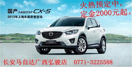 長(zhǎng)馬廣西弘駿店,即日起啟動(dòng)國(guó)產(chǎn)長(zhǎng)安馬自達(dá)CX-5預(yù)訂,國(guó)產(chǎn)馬自達(dá)CX-5是首款搭載“創(chuàng)馳藍(lán)天”技術(shù)的產(chǎn)品。CX-5老客戶推薦會(huì)于6月10日廣西弘駿店舉行,訂金2000元起,當(dāng)天訂國(guó)產(chǎn)CX-5即送3000訂車禮。詳詢:0771-3225588