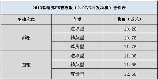 2013款哈弗H5智尊版2.0T汽油發(fā)動(dòng)機(jī)車型已于6月份正式上市!此次新車將提供兩驅(qū)、四驅(qū)在內(nèi)的6款車型,售價(jià)區(qū)間為10.28萬(wàn)-12.58萬(wàn),目前廣西弘泰長(zhǎng)城汽車店內(nèi)此款車型火熱預(yù)定中!