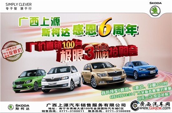 熱烈祝賀廣西首家斯柯達(dá)白金級(jí)經(jīng)銷商“廣西上源斯柯達(dá)4S店”6周年慶。為感謝廣大車主以來的長(zhǎng)期支持與厚愛。斯柯達(dá)泉廣西上源4S店6月22日(周六)13:30將在展廳舉行“廠家直銷 極限3小時(shí)”大型搶購(gòu)會(huì),鉅惠到底。報(bào)名熱線:0771-3100011