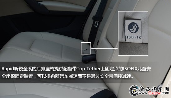 Rapid昕銳全系的后排座椅提供配備帶TopTether上固定點的ISOFIX兒童安全座椅固定裝置,能使兒童安全座椅與汽車結(jié)合為一體,可以提前隨汽車減速而不是通過安全帶間接減速。此外,其三點式固定方式是公認的最安全的兒童安全座椅固定方式。
