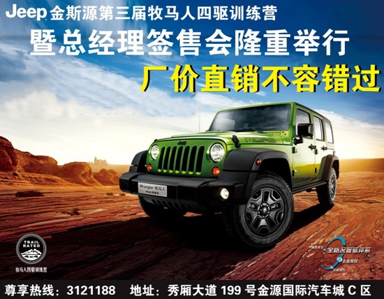 6月22日,克萊斯勒J(rèn)eep廣西金斯源4S店將舉行第三屆牧馬人四驅(qū)訓(xùn)練營活動(dòng),結(jié)合這次牧馬人四驅(qū)訓(xùn)練營活動(dòng),金斯源還特別推出Jeep牧馬人、13款Jeep大切諾基、13款Jeep指南者、克萊斯勒300C及克萊斯勒大捷龍的總經(jīng)理廠價(jià)直銷簽售會(huì)。這個(gè)周末,好玩、刺激的試駕活動(dòng),抄底價(jià)的讓利,讓您買到就是賺到。