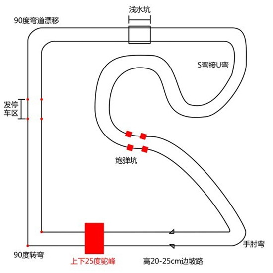 從發(fā)車區(qū)直線駕駛到第一個直角彎,左轉(zhuǎn)進(jìn)入25度駝峰,然后通過一個高20厘米高的邊坡路后左轉(zhuǎn)進(jìn)入炮彈坑,接著一個連續(xù)的S彎,通過淺水坑后結(jié)束試乘試駕。