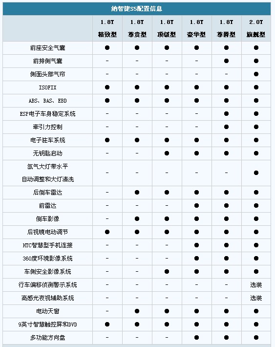 配置方面,國內(nèi)媒體報(bào)道納智捷S5共有六款車型可供選擇。從表中我們可以看到,前排安全氣囊、電子駐車系統(tǒng)、后視鏡電動(dòng)調(diào)節(jié)、9英寸顯示屏等都是標(biāo)配。